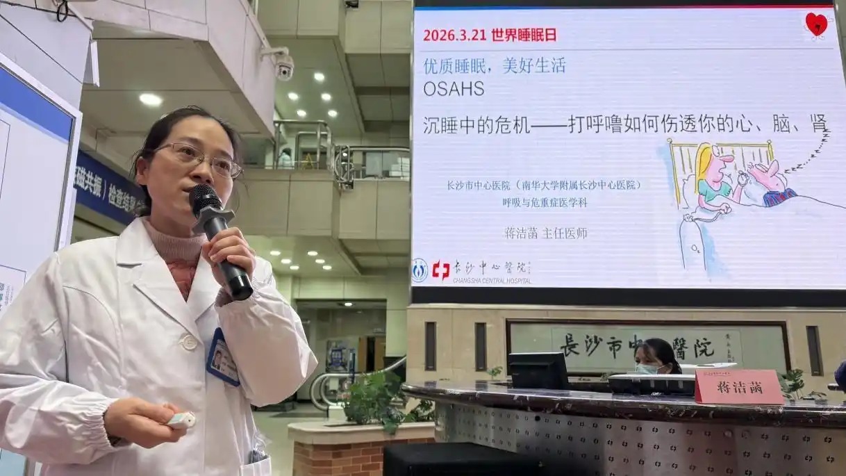 3月19日,呼吸与危重症医学科在医院门诊大厅开展科普讲座,专家用动画和图片向大家讲解打呼噜对心脏、大脑、肾脏的危害,现场发放自测问卷,吸引不少市民驻足学习。随后,科普团队又来到赤岭路社区、侯家塘社区,用血氧监测图讲解睡眠呼吸暂停的危害,并教大家 “网球缝背法”,帮助大家通过侧卧睡觉改善打鼾。